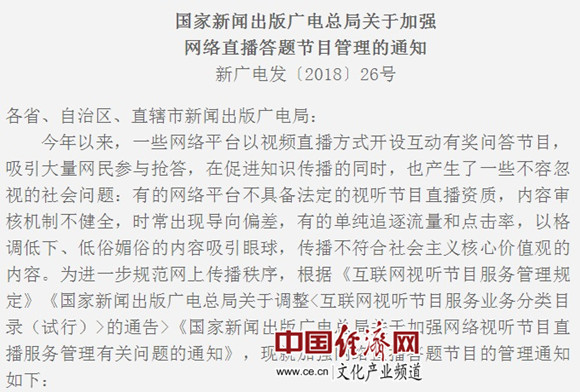 國家新聞出版廣電總局關(guān)于加強(qiáng)網(wǎng)絡(luò)直播答題節(jié)目管理的通知