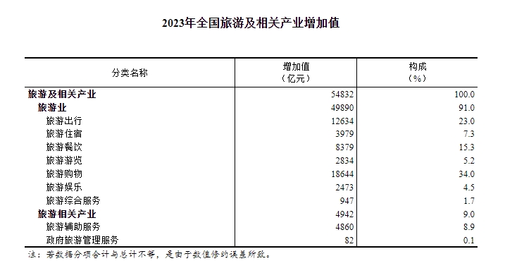 從內(nèi)部構(gòu)成看,旅游業(yè)增加值為49890億元,占旅游及相關(guān)產(chǎn)業(yè)增加值比重為91.0%,比上年提高1.7個(gè)百分點(diǎn)。旅游相關(guān)產(chǎn)業(yè)增加值為4942億元,占旅游及相關(guān)產(chǎn)業(yè)增加值比重為9.0%,比上年下降1.7個(gè)百分點(diǎn)。