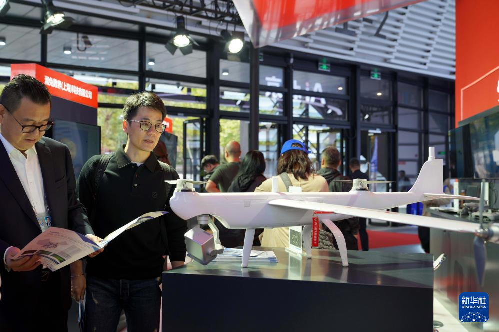 11月6日,嘉賓在觀看可提供空中巡檢服務的“道通龍魚 Pro”垂直起降固定翼。新華社記者趙宇思攝