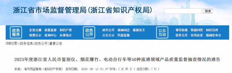2024年6月12日,浙江省市場監督管理局網站發布2023年度浙江省人民幣鑒別儀、煙花爆竹、按摩器具、電動自行車等50種流通領域產品質量監督抽查情況的通告。
