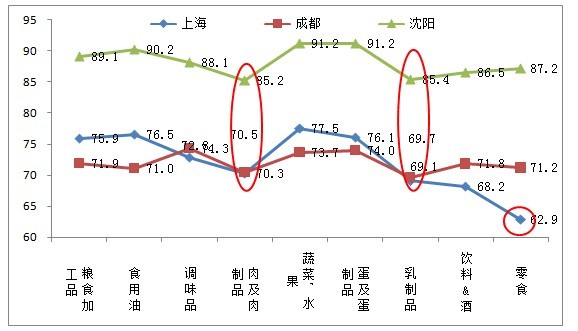 針對食品安全現狀信心指數較低的三個城市:上海、成都、沈陽。沈陽表現相對較好,信心指數較高;其次是上海;最低的是成都。其中肉及肉制品和乳制品在三大城市中的安全信心指數都相對偏低,直接影響了三大城市的綜合信心程度。此外,食用油在成都的安全信心指數、零食在上海的安全信心指數也有待提高。